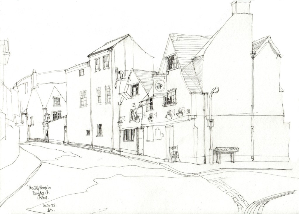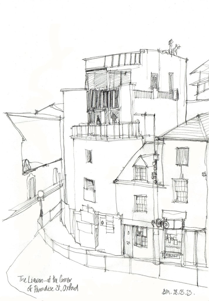 One of the nice things about sketching here is that you tend to meet some interesting characters. Before I met a guy who documents the on-going re-development of Oxford ( I would like to think that there are more people out there recording the changing face of their local environment) and on this particular occasion someone that formerly lived in sheltered housing here on Paradise Street before that was all pulled down.