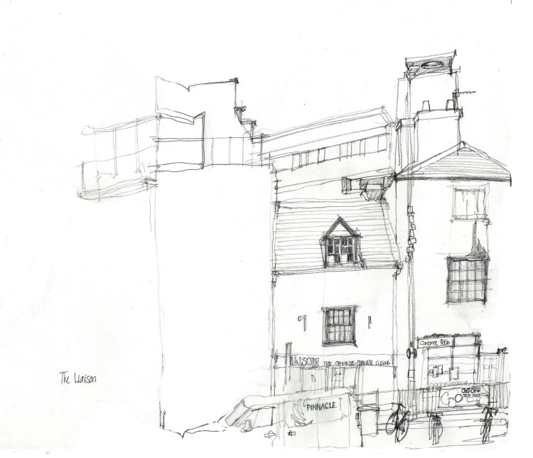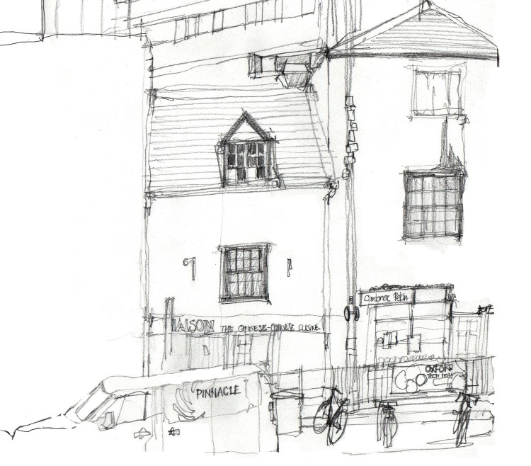 So on a wet and dull day I ventured back into the city and sat on the steps of the Westgate shopping centre to do yet another sketch of the old Liaison Cantonese take-away. This is one of a series of drawings charting the progress of the building of new flats on the corner of Paradise Street and Castle Hill in Oxford. The Liaison take-away is right next door and must have some sort of protective status, otherwise it would have been long gone by now – removed with a few swipes of an excavator bucket.