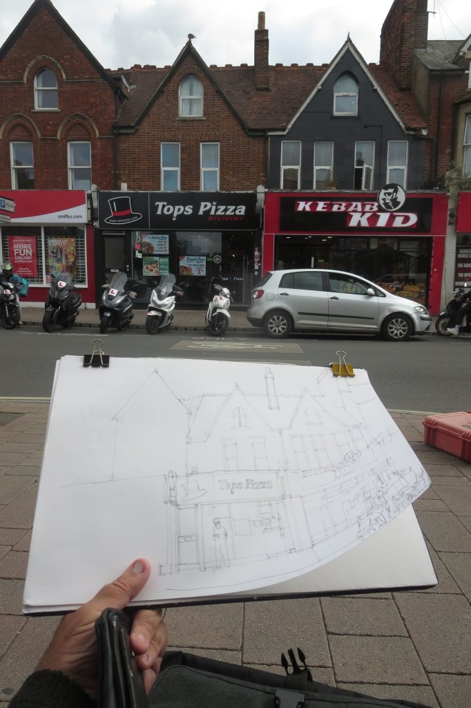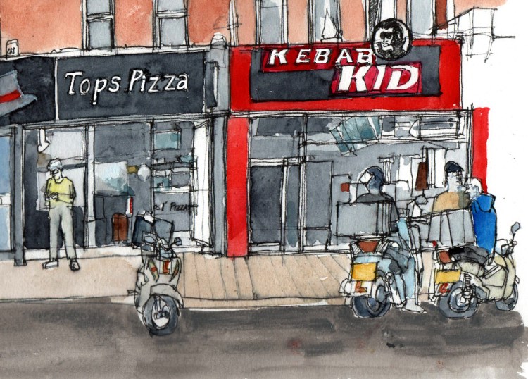 So, continuing on a theme, yesterday I was back drawing more fast food places – this time the Kebab Kid & Tops Pizza out on the Cowley Road. This is a part of town out from the centre which is perhaps a little rough around the edges but definitely has some character. The people are also generally quite friendly.