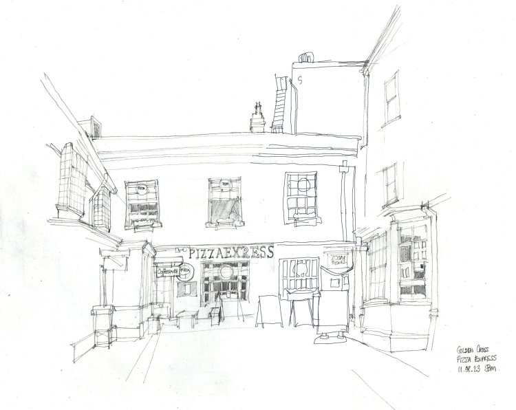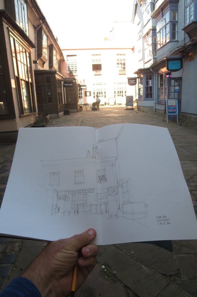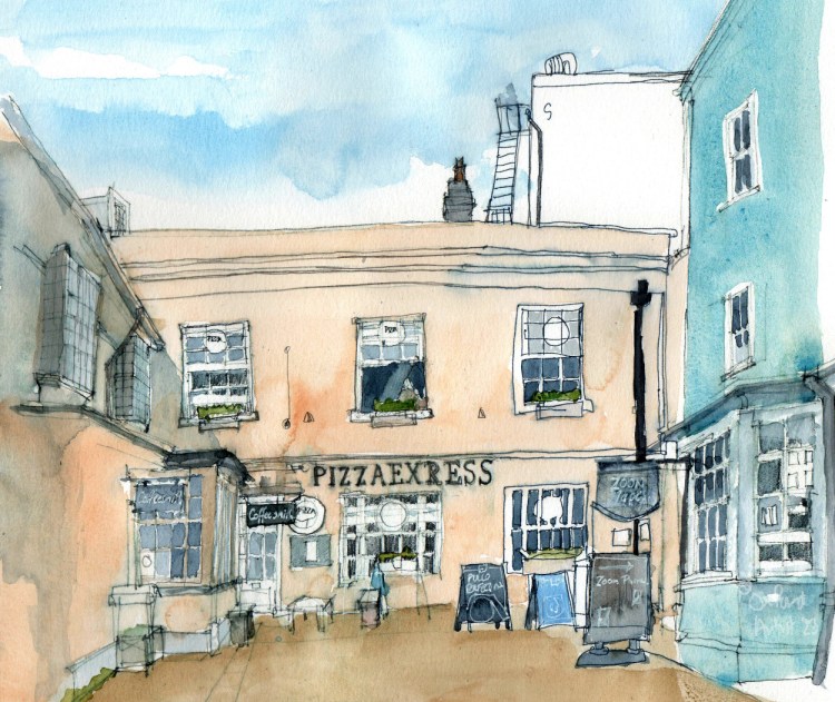 With my back to Cornmarket and Oxford’s busy shopping streets, I set to draw the courtyard focusing on what is now a Pizza Express at its far end.