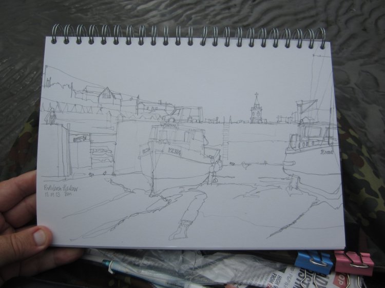 It was a bit late in the summer but I managed to get away for a week’s holiday in Cornwall before the weather turned. Even so, I didn’t get that much time to sketch as the week flew by. I did, however, remember, to take my wellies and made a point of spending a couple of hours in Porthleven harbour sketching.