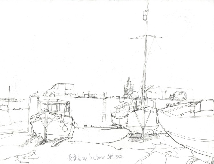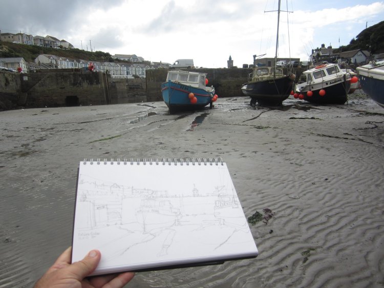 Those of you who follow my blog may recall I took a similar holiday last year and possibly recognise some of the views of Porthleven in this post. For me, I’d been looking forward to returning to the coast and drawing more of the Cornish harbours. Arriving at Porthleven at low tide on two consecutive days, donning my wellies and taking my folding sketching seat, it was easy enough to stroll down the main slipway and set up in the middle of the inner harbour.