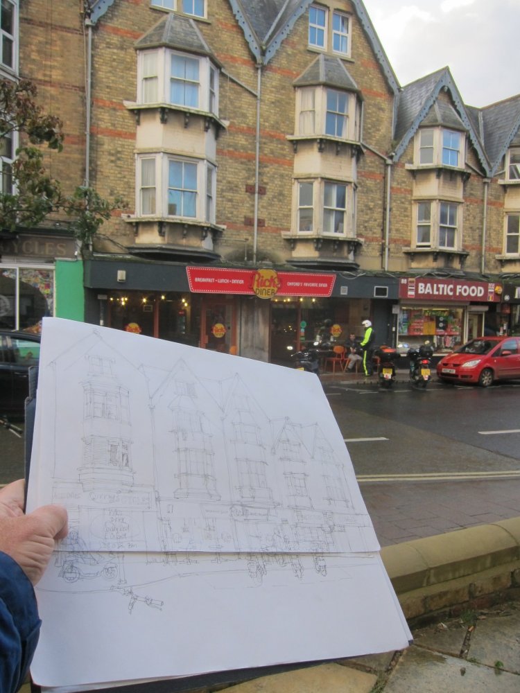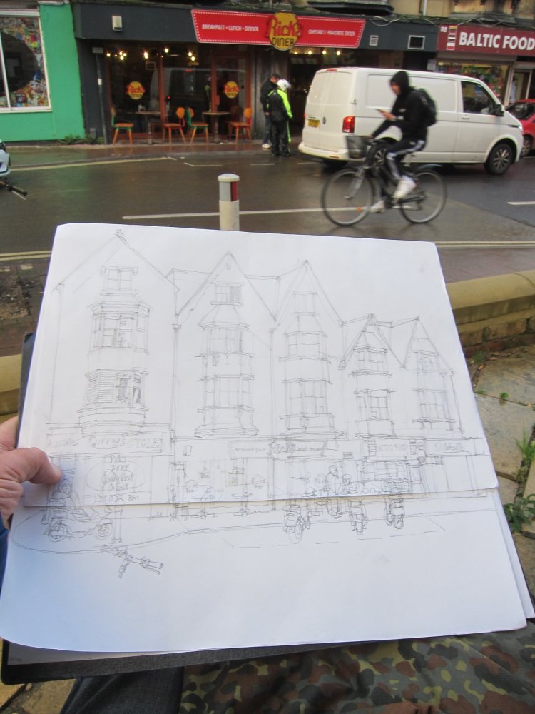 So last Sunday I went back and had a shot at drawing Rick’s Diner and the Baltic Cafe. This is a view and a series of shops that I’ve drawn before, except from a different angle. For those of you who follow my blog – some might recognise these buildings from another post – https://bryanmatthews.org/2022/10/25/sketching-shops-on-the-cowley-road-east-oxford/
