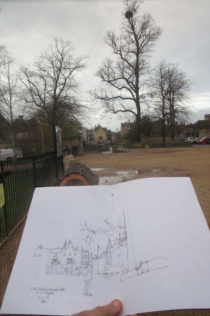 It has been wet and cold for a while and I have not been out doing as much sketching as I’d like. However yesterday the Sun came out briefly whilst visiting the Christ Church College Meadows and I did manage to do a couple of sketches. One is a re-hash of an earlier drawing, except in a looser style and the other is a whimsical view towards the Meadow’s gates and the town beyond.