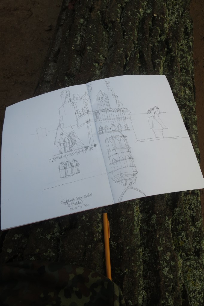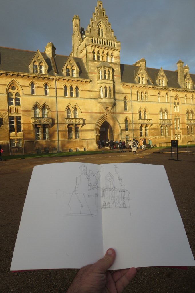 Here’s my view of The Meadows Building at Christ Church in that fleeting golden light -and with my partial sketch under-way.