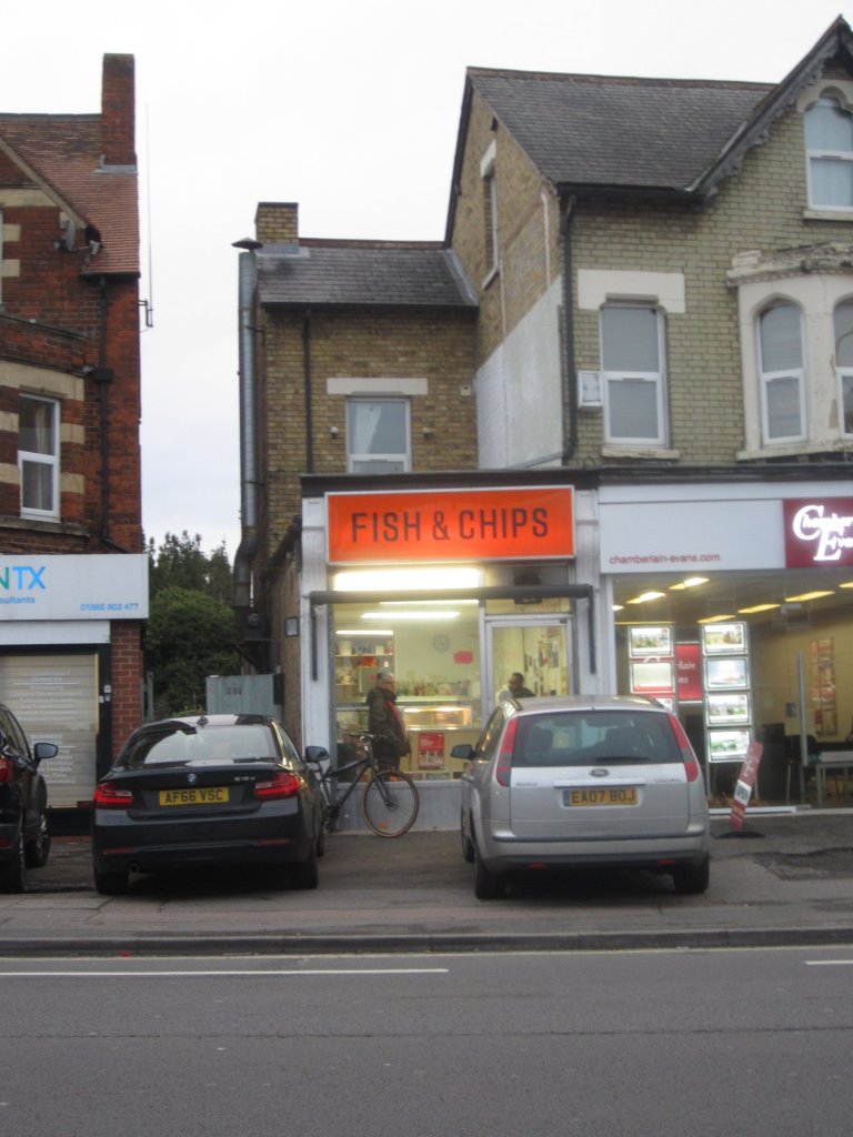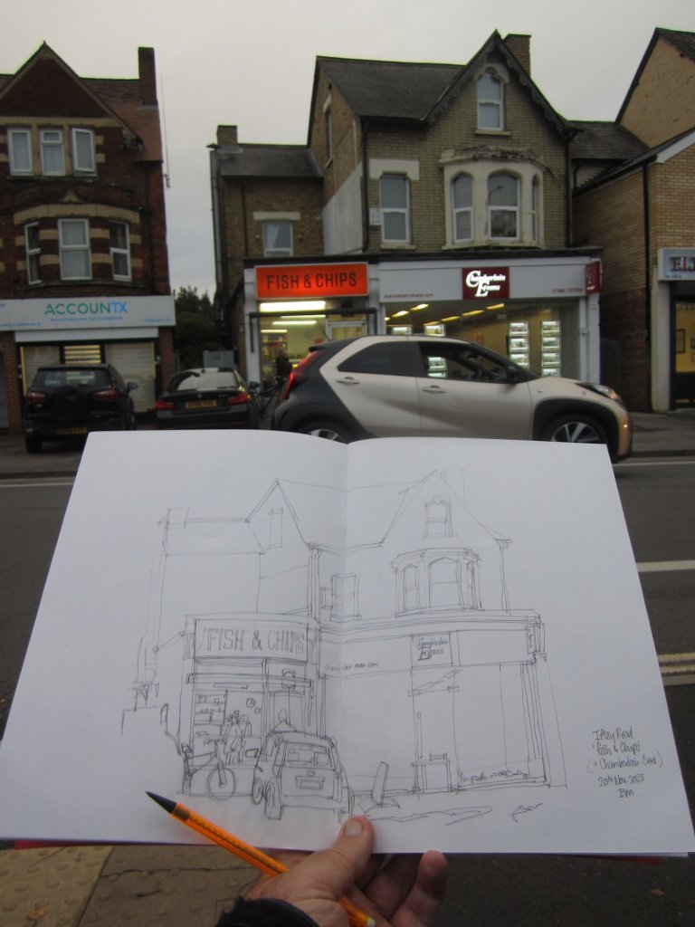 After cycling along the river to the south of the city, I headed back into Oxford via the Iffley Road. On a grotty, grey old day I decided to get my sketching stool out and try a drawing of the Fish & Chip shop there.