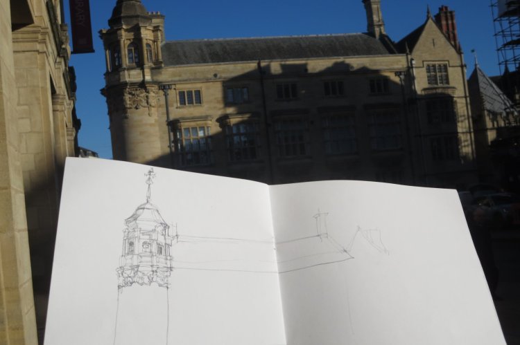 After a while the sun moved round, the temperature dropped and it was time to move on. In my case this meant going into the Weston to try a pot of their tea. Below is the view of my partial sketch of the Martin School and later a tidied up scan of the same.