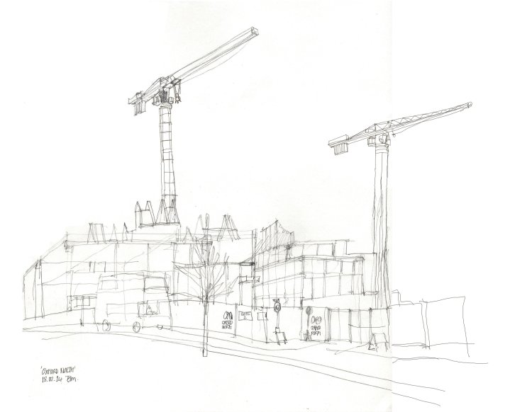 For the past couple of years it has been one big building site but over the past year the frame of the larger buildings have been going up. As you go past on the A34, the mixture of the concrete and steel framework with two tall cranes is quite striking. As an ‘urban artist’ I thought a Sunday afternoon was a good time to go and have a look and do some sketching.