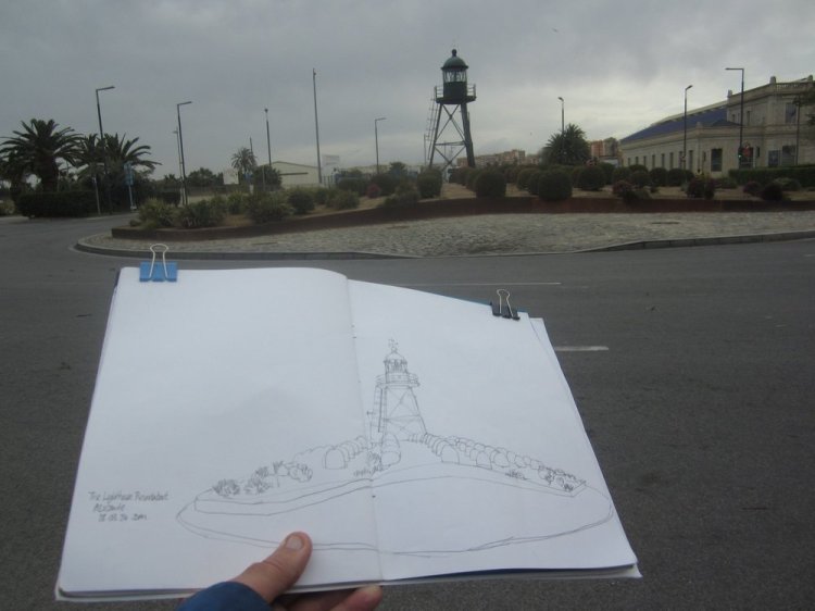 Here is my view of the lighthouse, sited on a roundabout to the south of the city. One advantage of being away from the main tourist areas was that it was relatively quiet apart from the traffic circumnavigating the roundabout. Sitting right next to the roundabout, cars would stop every so often at a set of changing lights. Most seemed pleasantly surprised to find someone sketching their local lighthouse and roundabout. I’m guessing this doesn’t happen very often.