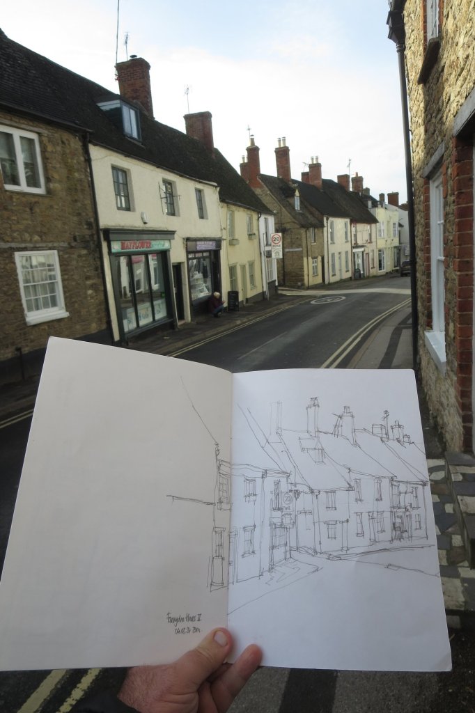 In the past I’ve drawn several sketches of Faringdon in West Oxfordshire and about a month ago ventured out again to draw parts of the town’s London Street. Coming down the hill into the town the road is lined with a mixture of houses that have largely been left relatively un-redeveloped. After finding somewhere to sketch, squeezing in on the narrow pavement to not get in the way, I did a couple of sketches.