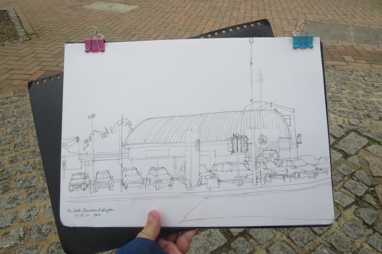 Sometimes you just fancy a bit of sketching – and fairly local to me in North Oxford there is our Skoda car sales showroom. It is a building that an urban sketcher might take an interest in with its distinctive modern roof. So, finding a convenient bench, I sat down and started drawing. it was quite an overcast day so my photos might not look that interesting (!) but that is what you get on a humdrum Friday evening. Besides I find that I don’t mind sketching cars – also something you tend to get used to as an urban sketcher!
