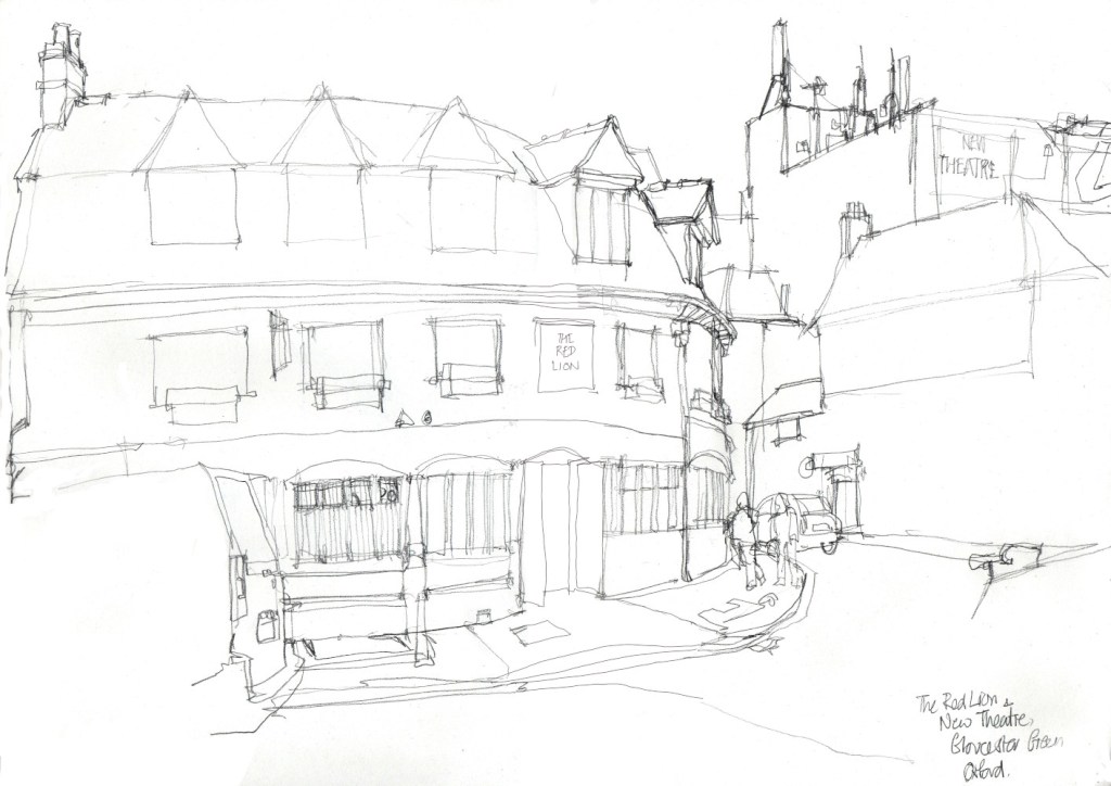 Walking back through the town in the early evening the light was still good. So with things winding down I found a chair outside a quiet cafe and did some more sketching. This is in an area by Oxford’s outdoor market- Gloucester Green. The rounded building is a pub (The Red Lion) and behind that are the back of buildings behind the New Theatre.
