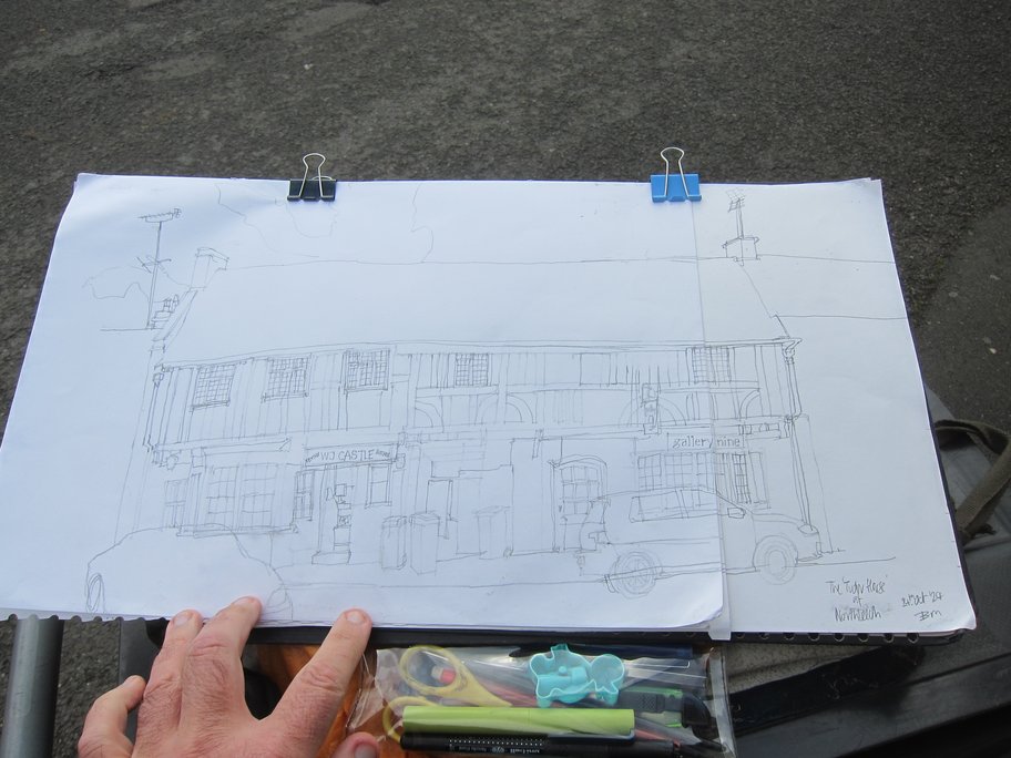 This is the view from across the carpark. Although I had originally set up to draw sitting down, that altered the viewpoint a bit too much and didn’t feel that safe because of the possibility of cars just driving into me. There was a solution – to borrow a wheelie bin from the local supermarket and draw using that. That worked surprisingly well and prompted thoughts of getting some kind of stand to draw from in the future… Anyway, here is my in-situ sketch.