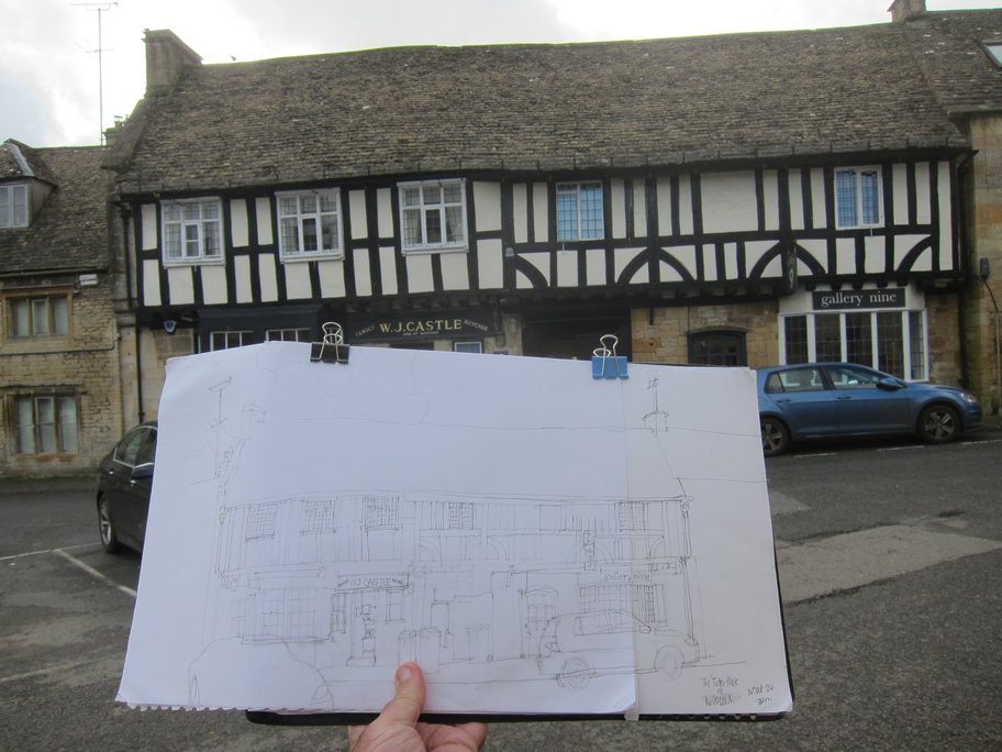 Northleach is one of the old ‘wool towns’ of the Cotswolds. most known for its large wool church, although it has many other old houses built in that Cotswold limestone. One of my favourite buildings is The Tudor House which is just a short walk from the main town square. This is somewhere that I’ve drawn before, hence the title of this piece.