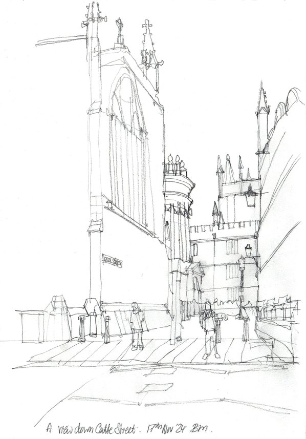 For a drawing comparison, here is a view from the other end of Catte Street from a post earlier in the year .