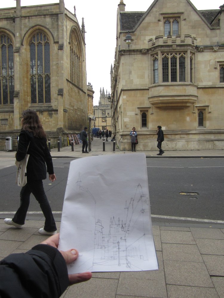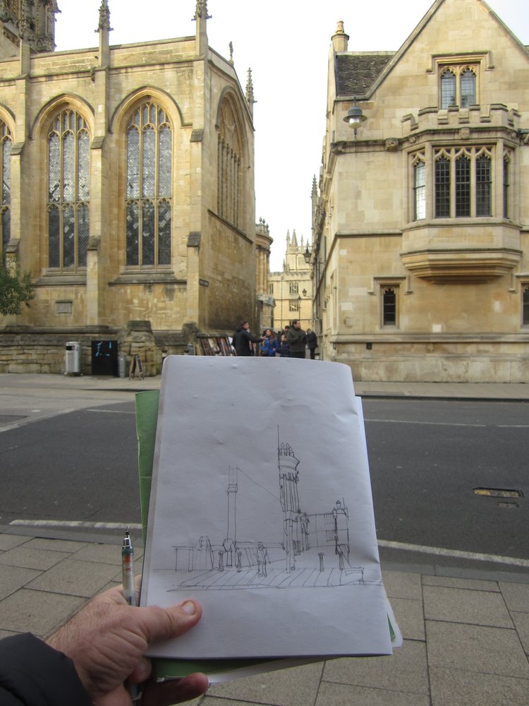 Sketching on the corner of Catte street and Broad Street, Oxford