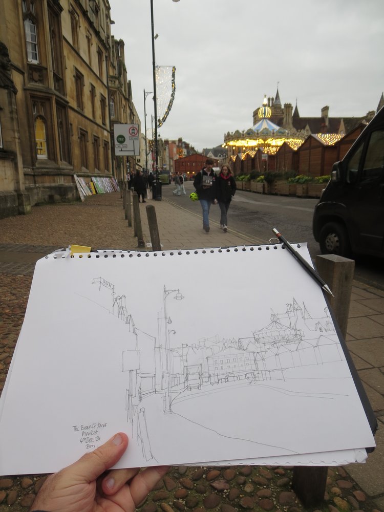 Occasionally I will come across the odd sketcher around Oxford – but not very often. So it was a pleasant surprise to come across a whole group of Urban Sketchers in the Oxford Covered market a couple of weeks ago. I decided to join them on their next outing – at the Oxford Christmas Market. … Continue reading Sketching the Oxford Christmas Market with the Urban Sketchers