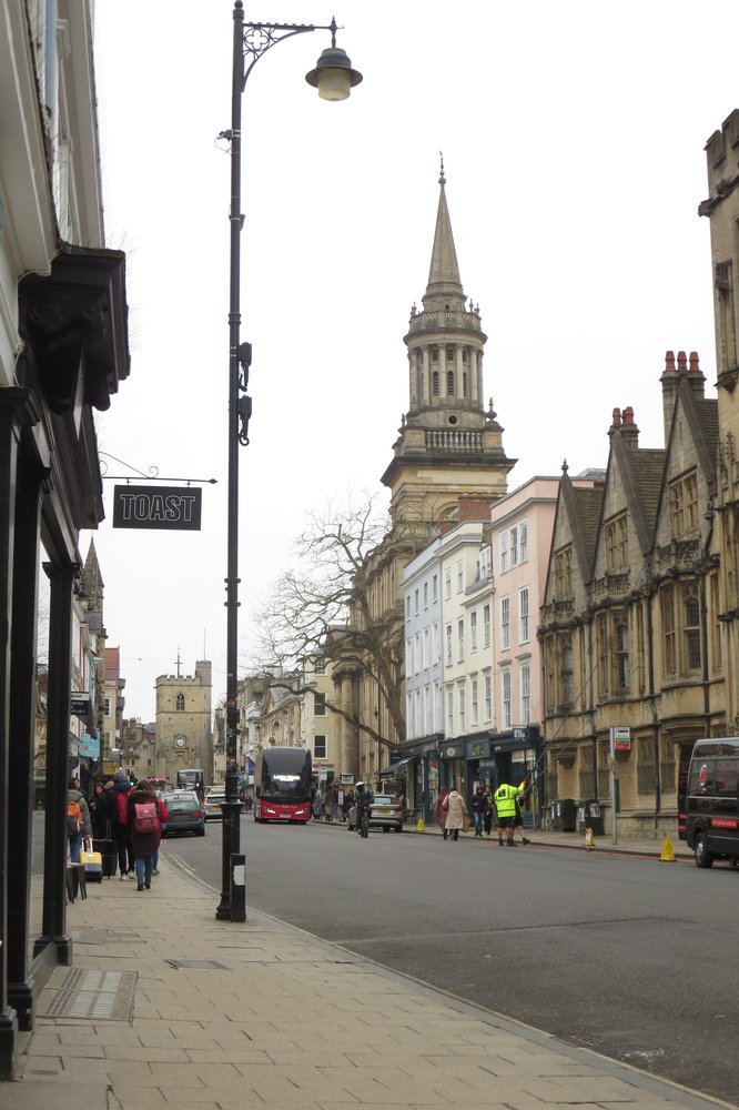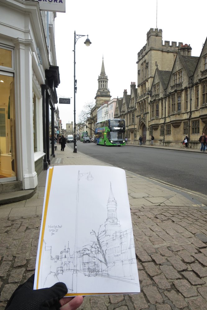 So with the temperature a few degrees above freezing and another solidly grey day I traveled into Oxford. I settled down to sketch a view of The High Street looking towards Carfax Tower – this at an old crossroads, commonly regarded as the centre of the city. With a few ” It’s chilly today” comments from passer-by’s, this was my view…