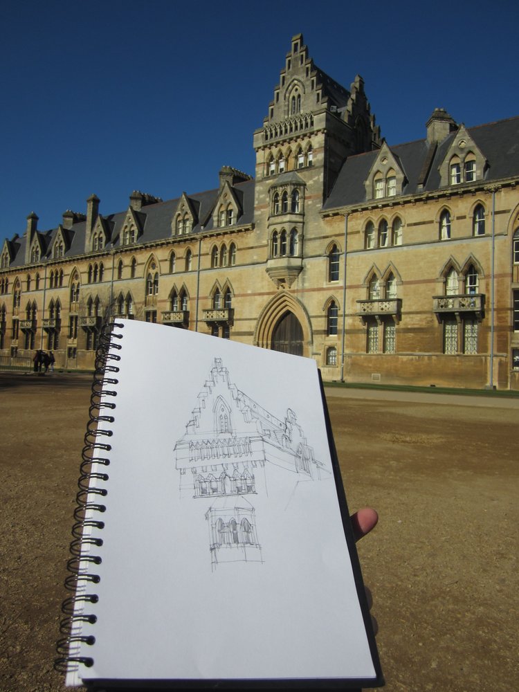So I suppose there is some variation in style – but that is also what makes sketching and painting more interesting. If you look through my work you will also find some more formal interpretations of this building and views around Christ Church. These are a contrast to the more whimsical- and wonky- line sketch above.