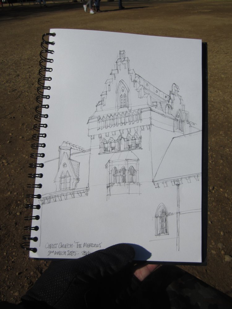 With the weather improving and a few days of sunshine coming our way, I’ve been tempted to go out more and do some sketching. So on a Sunday morning I made my way into Oxford and did a short walk to Christ Church Meadows. Finding a suitable bench I set about drawing the Meadows building on this crisp and sunny day. This is a subject I’ve tried before and I have previous posts which I will leave links to at the end of this post.