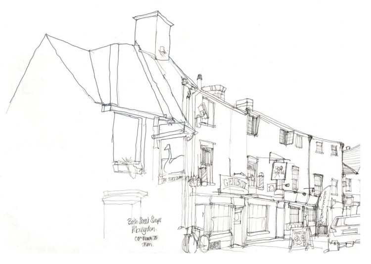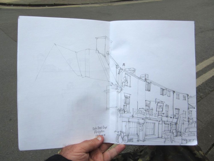 The town also has other attractions but for me Bath Street is another favourite. This is an old road, now partly cut off by the inner ring road. It is slightly run down – but that adds to its charm. It has a charity shop, a host of eateries, pubs and the rather wonderful Mason’s embroidery and materials shops. It’s also a bit quieter than the rest of the town and as it happens, is a good place to do some sketching on a Saturday afternoon.
