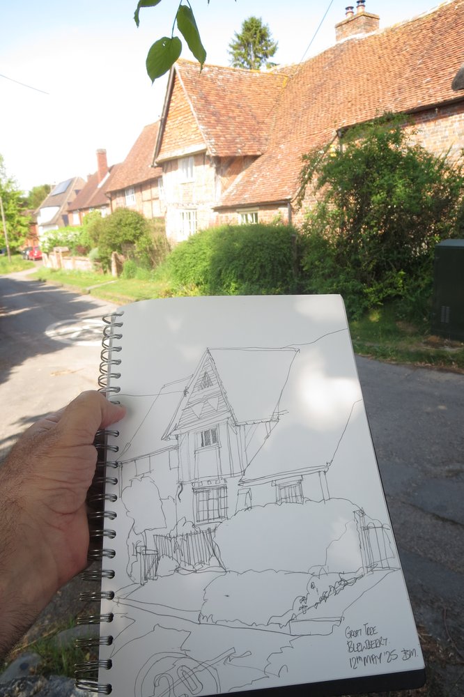 Just off the main road is Great Tree cottage. Finding some shade, I set about sketching. Here is my view, my in-situ sketch and a later scanned version.