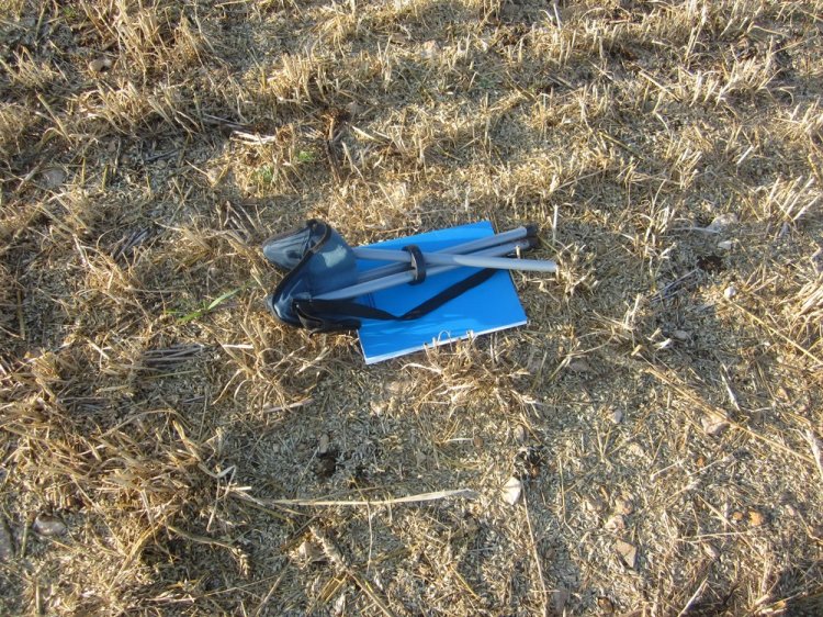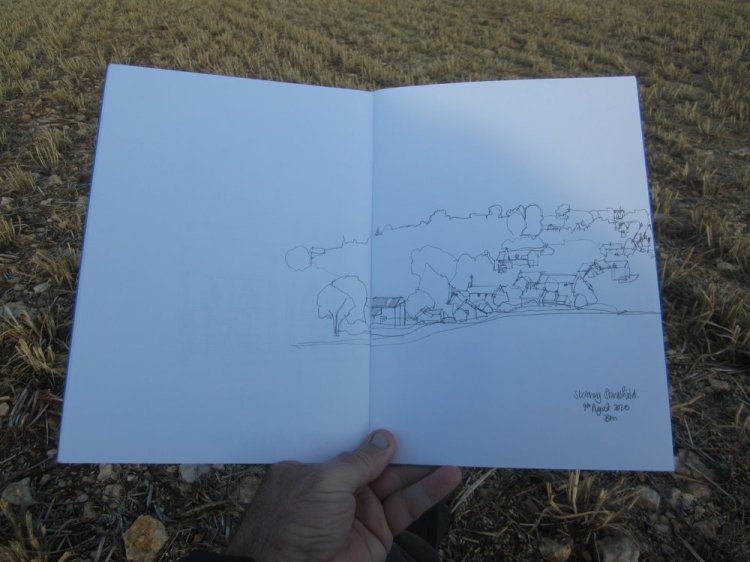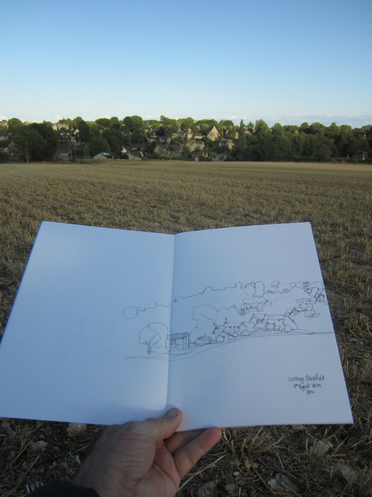 To the west the countryside opens out to more rolling fields – and there is a view back to the village (below). With this particular field already harvested, I took a little stroll, set up my sketching stool and started drawing.