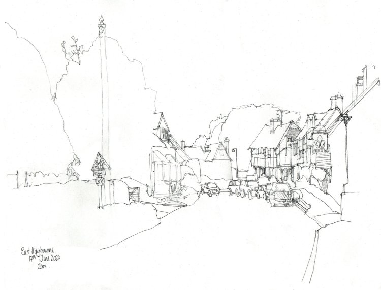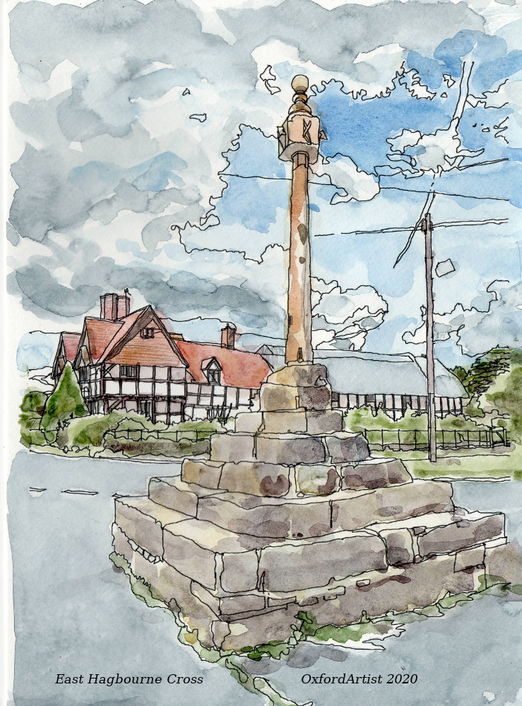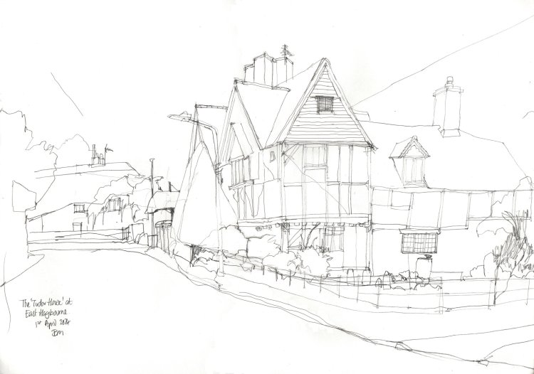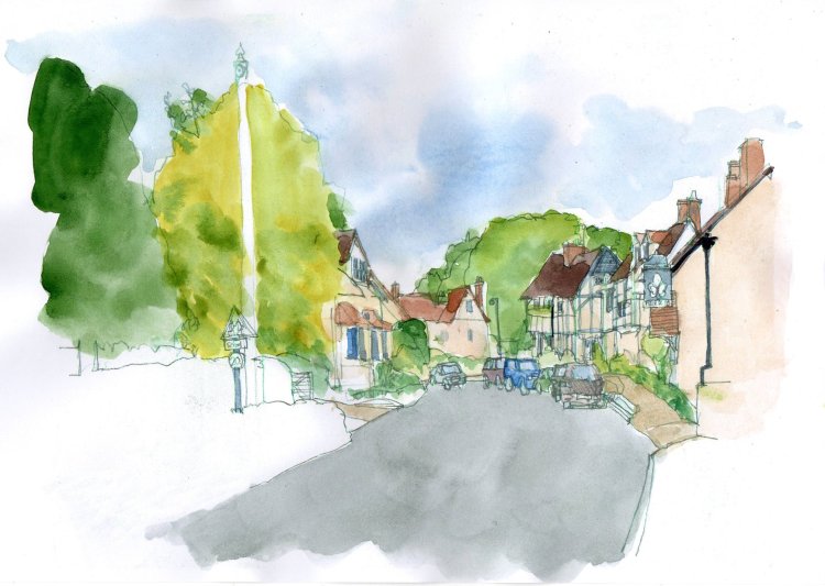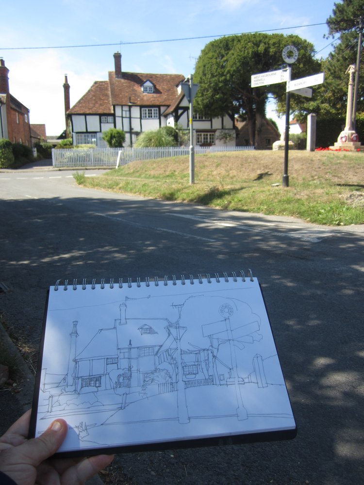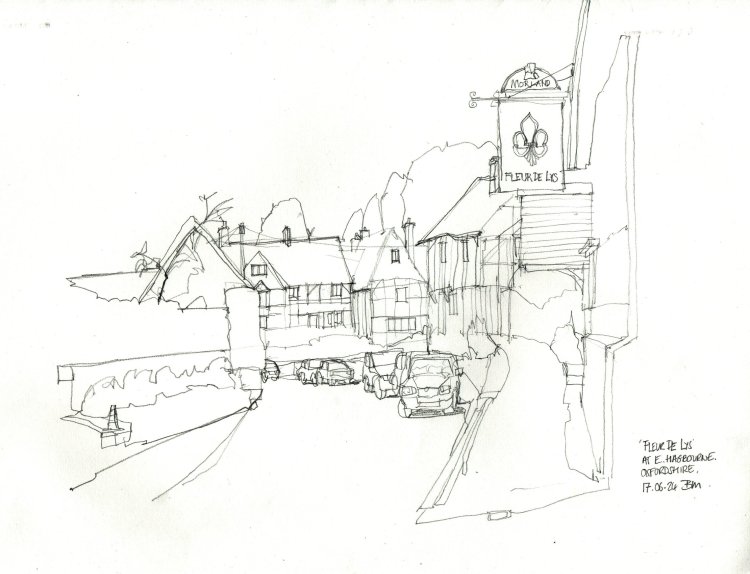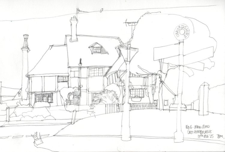 East Hagbourne in southern Oxfordshire is a good example of an unspoiled village, though its residents are possibly looking over their shoulders at the encroaching town sprawl of Didcot just to the north. The village has a decent pub, an old church, a tiny shop, two memorial crosses and a host of charming vernacular houses. It’s somewhere I’ve visited and drawn quite a few times. So on a warm summer’s Sunday lunchtime, I found some shade and decided to draw one of the houses at the far end of its Main Road: No.6.
