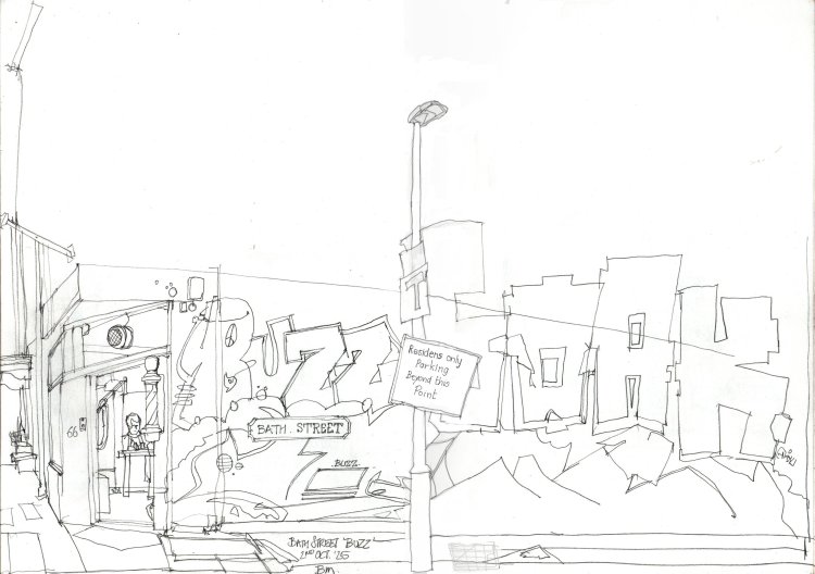 Bath Street is a small side street in an area known as St. Clements – just to the east of the Oxford city centre. There’s a main road lined with a collection of pubs, eateries, fast food places and a few little shops. There is also a lot of student accommodation in the area and it is just a bit run down and tatty around the edges. For me as an urban sketcher – that’s good. I prefer to draw slightly wonky, even derelict buildings in much the same way as I like to draw old venicular buildings that are a bit warped and skew.