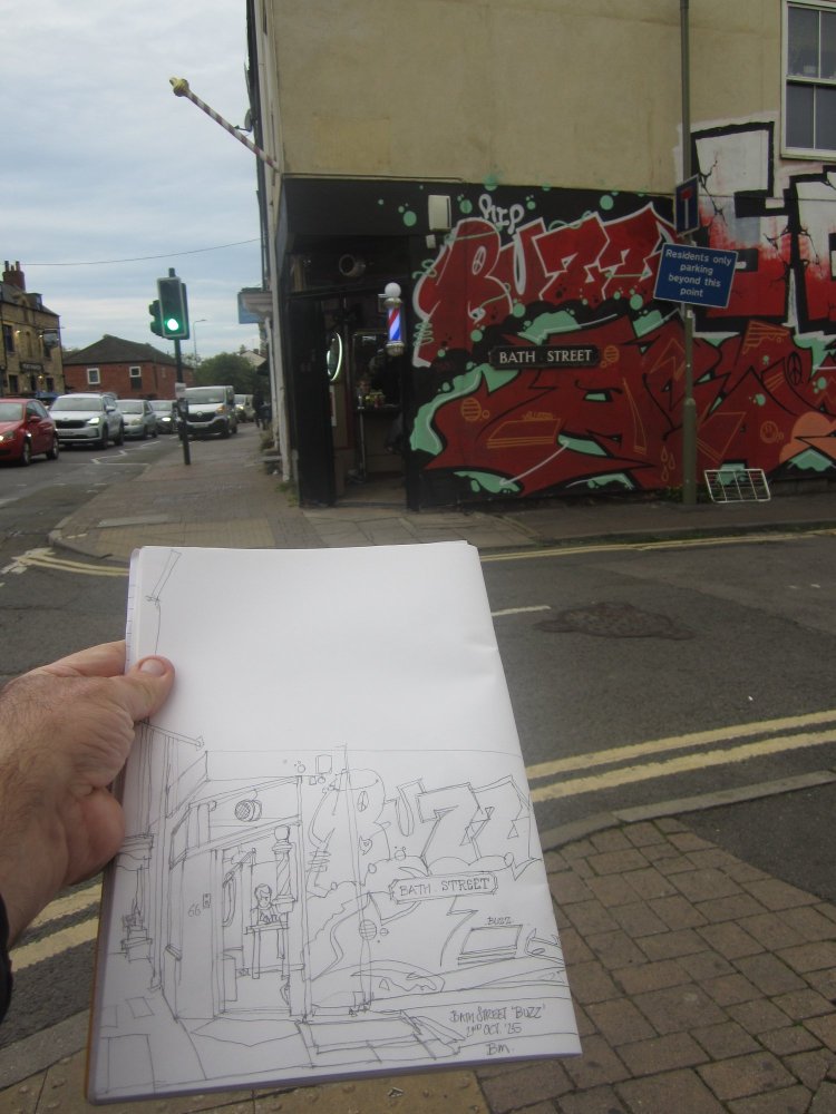 My subject for this exercise in sketching was focused on a local hairdressers – The ‘Loyalty’ hairdressers. It had a couple of guitars in the window and someone had obviously put some effort into decorating the place. This stretched to a big side wall with large lettered graffiti – street art! One of the things with sketching is that it gets you to notice and focus on things that you usually wouldn’t and it adds to the difficulty when you try to decipher these elaborate scripts.