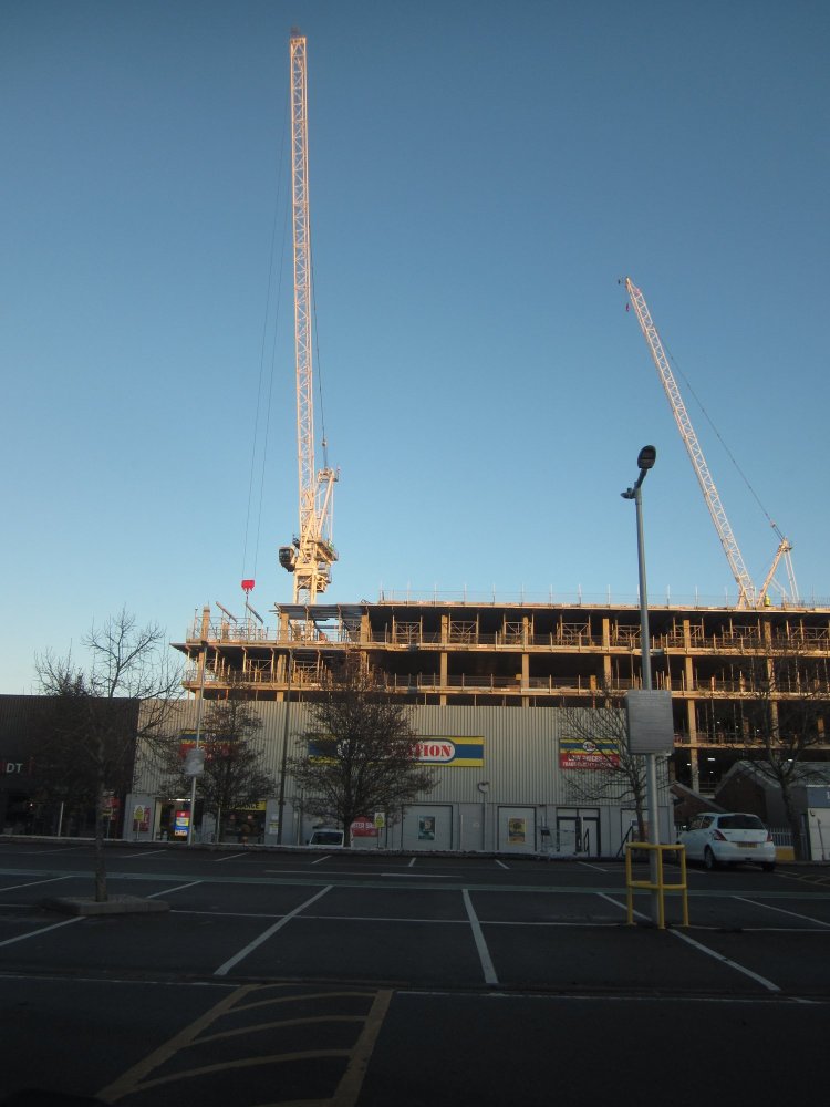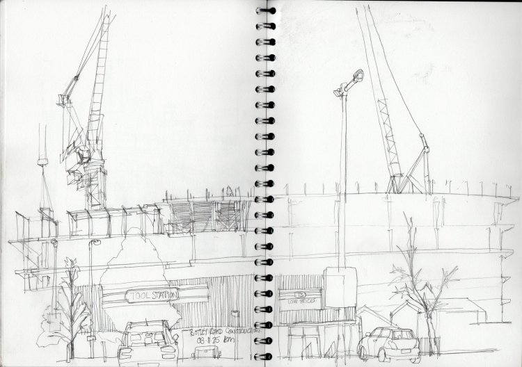By the way – those cranes are pretty complicated things when it comes to drawing them, particularly when they have a habit of moving around during working hours. The construction crew seemed to be doing a good job as a whole new bit of building was added while I was sketching.