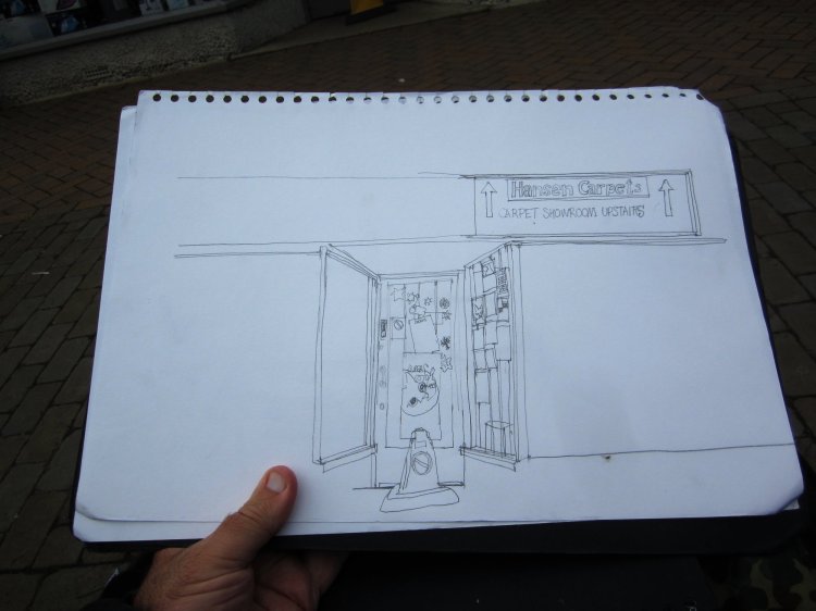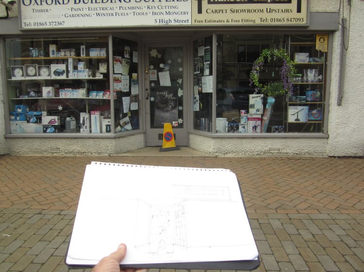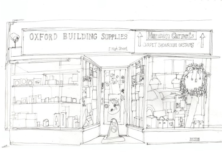 Kidlington is a village just north of Oxford and it is home to Oxford Building Supplies. This is one of those endangered species of shops – a bits and pieces hardware shop. I have to admit I have a soft spot for this kind of store – whether it is a ‘bits and pieces’ car factor place, an old fashioned toy shop that has been there for years, or a non-chain hardware shop. So you might be surprised to find me doing a drawing of it, though to me this is just an extension of various urban sketches of other small shops and eateries around Oxford. I think it is actually a good thing to record this sort of place. Consider it an appreciation of small businesses not yet swallowed up by bigger chains.