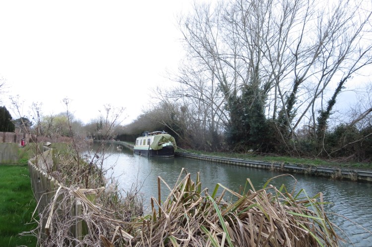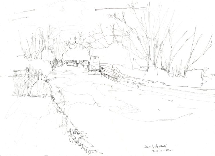 Looking back at my previous posts I have another sketch (below) from a similar spot but going back a few years – on a day when there was a frost and some ice forming on the canal! So maybe this is something I do each year at the end of winter before Spring gets properly going. There doesn’t seem to be much difference in technique. I do think having a boat closer and more centre-stage helps the composition, as does adding some larger foreground detail from the reeds .