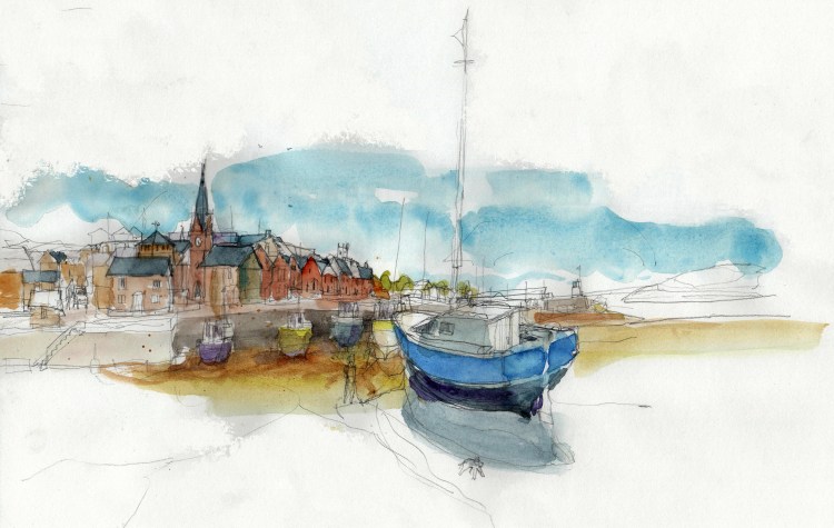 On a wet end of winter’s day I’ve been going through sketchbooks and doing a few watercolour sketches, mostly of Cornish harbours. However here is one of a purely imaginary harbour scene, which I hope you like.