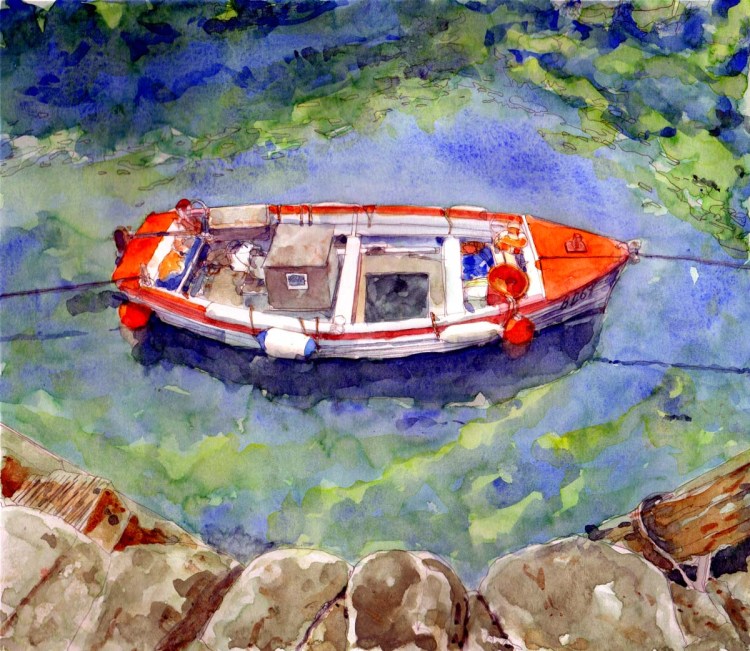 Here is one of my more colourful experiments in a view of a small fishing boat. I think this is from a view from the harbour walls at Clovelly in Cornwall.