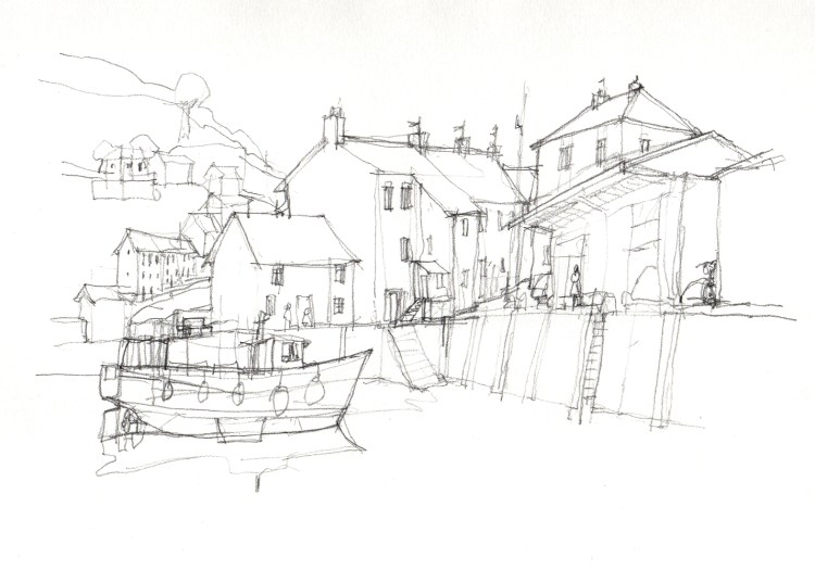 Lately I’ve been sketching and working on studies for various harbours around the UK. This is my latest – a sketch of the harbour at Polperro in Cornwall. Over the next couple of days I will also post these other sketches with the aim of using them as a basis for watercolours to follow.