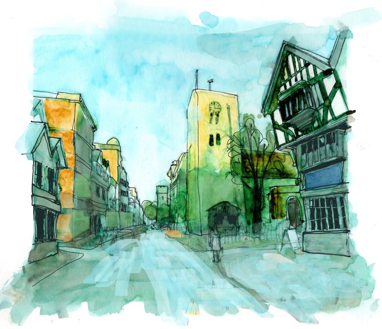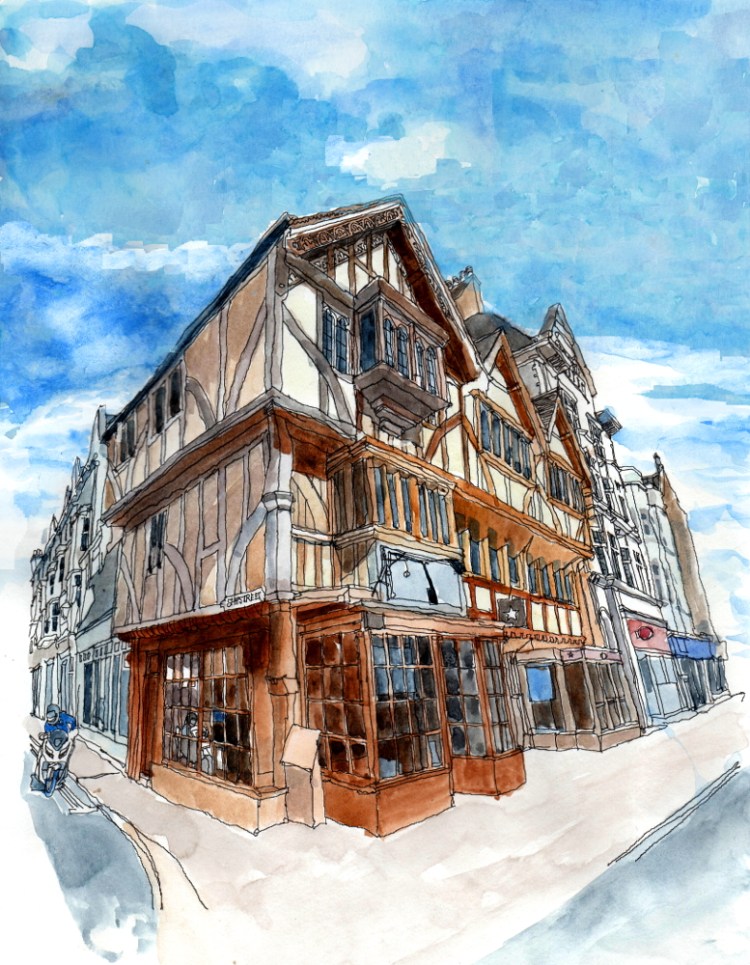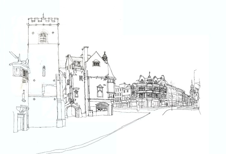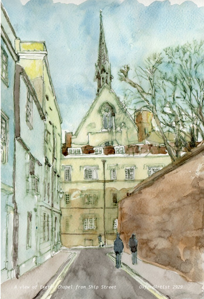 A watercolour sketch of some of the colourful vernacular buildings and shops along Broad Street. The roof and tower of the Exeter College Chapel is in the background.