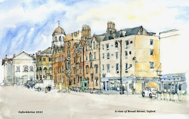 A few days ago I posted a drawing and a watercolour view of Broad Street in Oxford. I also mentioned that I might extend this panorama out a little, and possibly to add a couple of passing cyclists – the above is the result of this little experiment in watercolour. It is a bit sketchier […]
