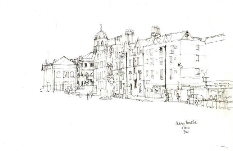 A rough sketch of buildings on Broad Street in Oxford. From left to right are the Weston library, the former Indian Institute, the Clarendon building and the Sheldonian Theatre.