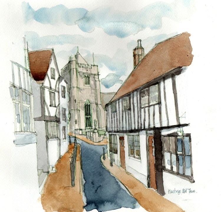 This is my painting of a street-view in the old town of Hastings, down on the south-east coast. My original drawing was done from a photograph found on the Wikimedia Commons, showing narrow streets, half-timbered buildings and Parish Church of St. Clements. My thanks to Wikimedia and to Stefan Noble for putting the photo up […]