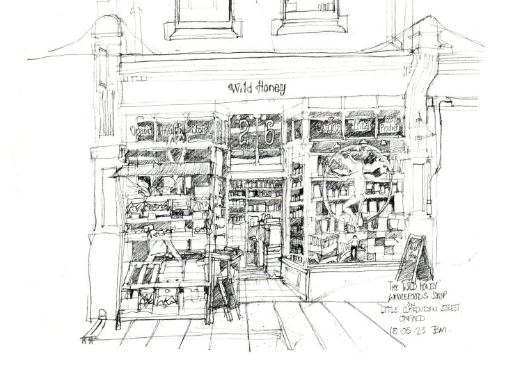 Little Clarendon Street is just north of the city centre in Oxford. Its a street of eateries, cafe’s and bars and a few other shops set amongst various University buildings. Rather than indulge in the cafe society my interest was instead in drawing the Wild Honey Wholefoods shop. Here is a view of the shop-front. […]