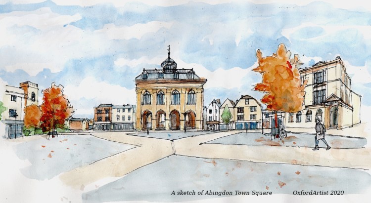 After my last post ‘sketching Abingdon Town Square’ , I’ve been working on putting together a more panoramic view. Above is the resulting finished watercolour sketch and below is my drawing for this… It is still very much a work in progress but something that is fun to do.